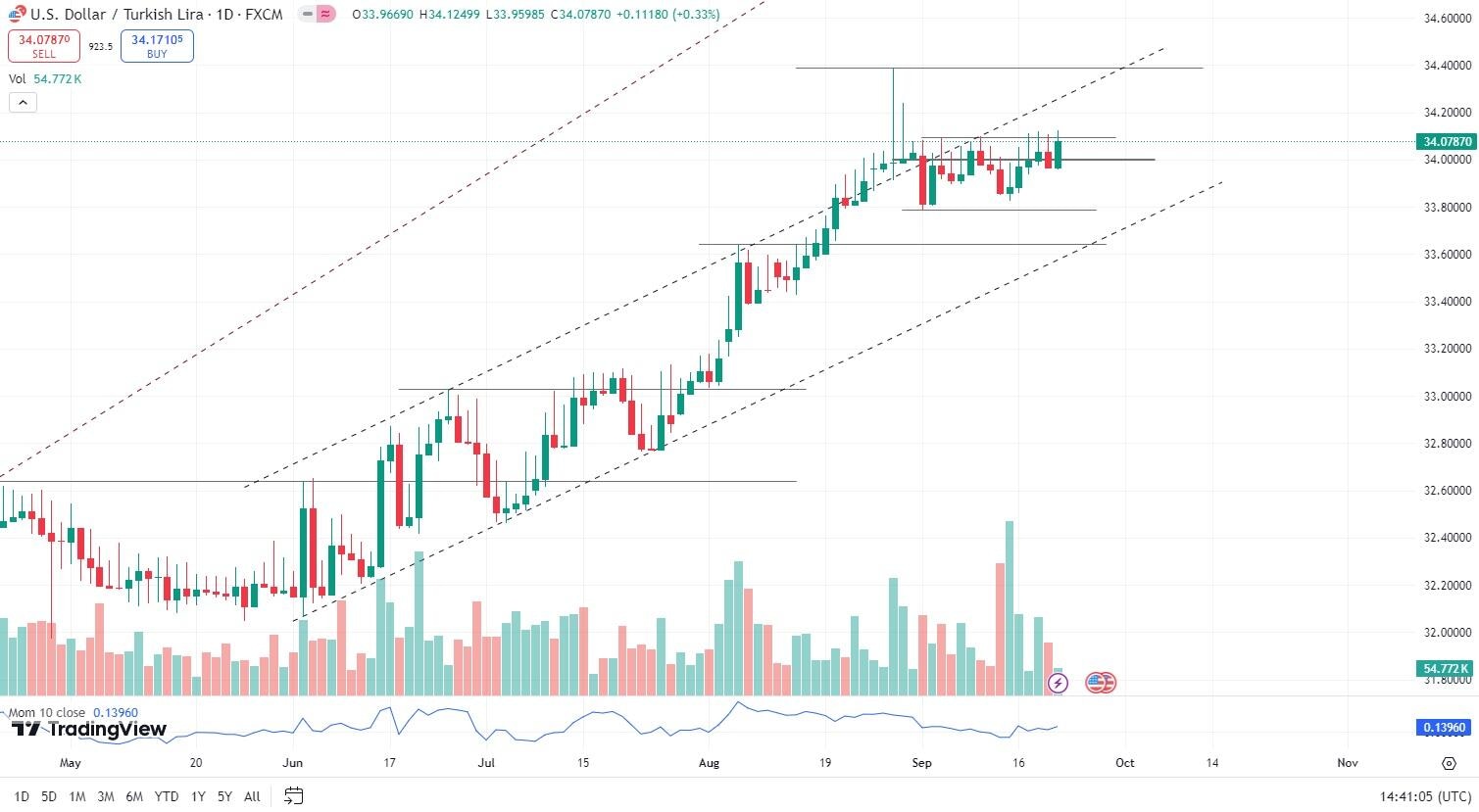 The USD/TRY pair closed at 34.078 on the FXCM platform last Friday (CBRT reference rate: 33.9531 - 34.0142). After breaking the resistance level around 33 in early August, the pair surged to a new all-time high of 34.388 on August 28. The exchange rate briefly retraced to 33.78 at the beginning of September and has been trading sideways since then, hovering near the psychological resistance of 34.