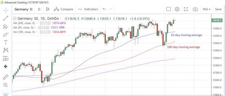 The Germany30 index hit a record high yesterday from records going back to 2003, boosted by the sentiment on Wall Street