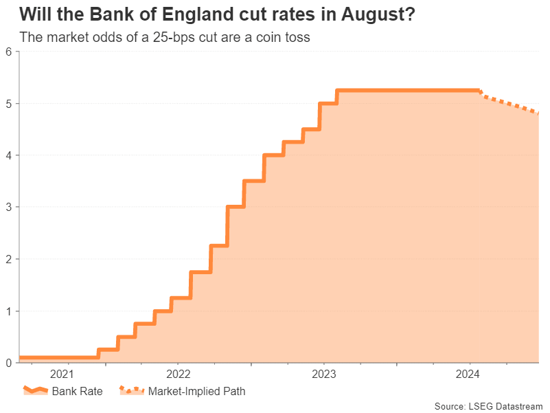 What may ultimately sway MPC members’ minds is the bank’s updated quarterly projections. If they decide to start easing, it will likely be a close call and be communicated as a hawkish cut amid the persisting upside risks to inflation. So, despite a cut not being fully priced in, the pound may not necessarily slide much on the news.