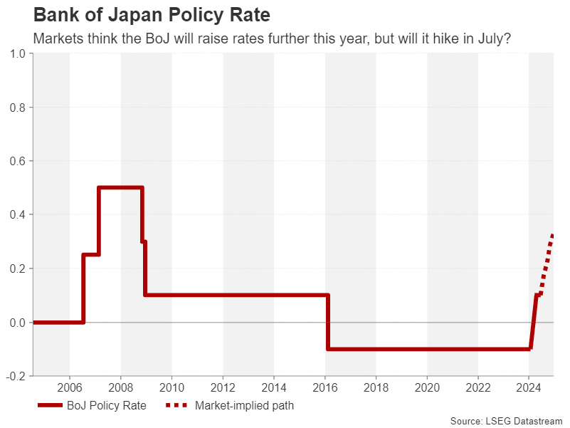 However, there is less clarity about the likelihood of a rate hike as policymakers do not appear to have made up their minds yet on the precise timing of one even though most agree that further increases will be necessary this year. Investors on their part have upped their bets of a July move and a 10-basis-point hike is now about two-thirds priced in. Hence, there’s a lot of room for disappointment if the bank keeps rates unchanged.