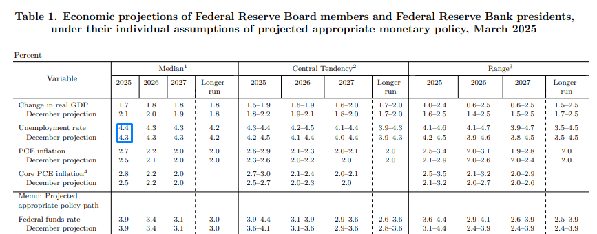 140,000 new payrolls, down from February’s reading of 151,000 (estimate range is currently between 175,000 and 80,000). Unemployment is forecast to have remained at 4.1% (estimate range between 4.2% and 4.1%). Of note here, you may recall that in the Fed’s latest round of quarterly economic projections, unemployment is forecast to increase to 4.4% this year (see below). Average hourly earnings are expected to remain unchanged MM, rising 0.3%, while YY data are projected to slow to 3.9% from 4.0% (estimate range between 4.3% and 3.9%).