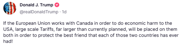 Without question, despite a slew of US jobs numbers on the docket this week, developments surrounding Trump’s reciprocal tariffs will dominate sentiment. In a nutshell, the Trump administration is expected to remove trade imbalances with other countries. Tariff threats, of course, will likely continue to claim headlines leading up to 2 April. Recently, Trump announced that a 25% tariff would be imposed on all cars imported into the US, which will take effect on 3 April, and stated, ‘This is the beginning of Liberation Day in America’. Additionally, via Trump’s Truth Social platform, he targeted the European Union (EU) and Canada, warning that were the EU and Canada to work together ‘to do economic harm to the USA’, he would impose ‘large scale tariffs’ (see below).