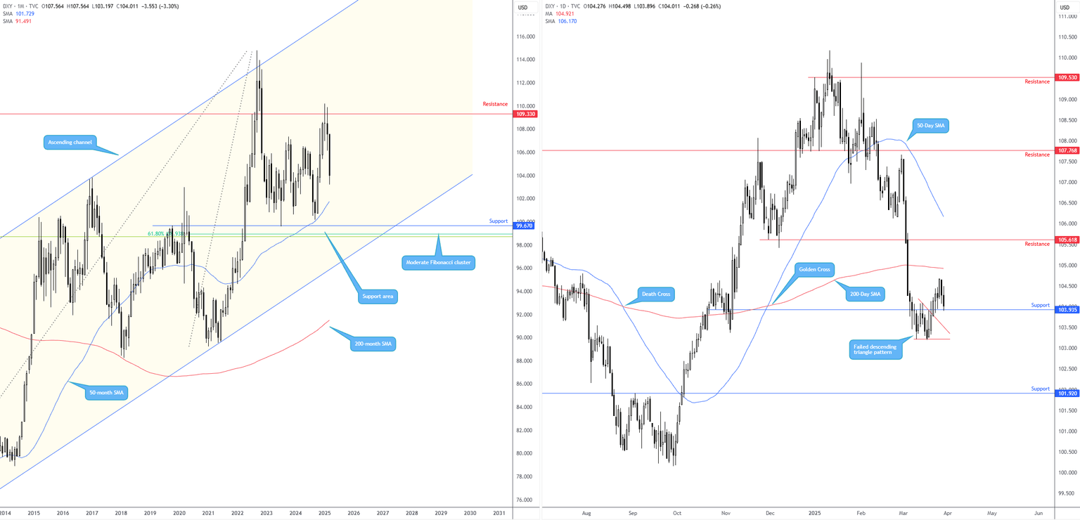 Therefore, this week, I will watch the EUR/GBP cross (euro versus the British pound) closely (see below). The monthly chart shows support is in play at £0.8229-£0.8315. While price is poised to end March on the front foot from the noted support, the previous rebound (2022) failed to print a meaningful higher high, suggesting that a push higher is likely to be contained by trendline resistance, taken from the high of £0.9504. Out of the daily chart, the ‘alternate’ AB=CD I highlighted earlier last week at £0.8331 (1.272% Fibonacci projection ratio) held the pair higher into the close last week and saw price test the 38.2% Fibonacci retracement ratio from £0.8367, derived from legs A-D (a common initial profit objective). With AB=CD longs now likely eyeing the 61.8% Fibonacci retracement ratio at £0.8398 (common second profit objective), H1 supports from £0.8348 and £0.8358 are worth keeping an eye on at the open this week.