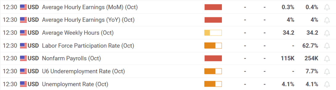 For October, economists expect the US economy to have created 113,000 new positions, sharply down from the 254,000 jobs created in September. The Unemployment Rate is foreseen at 4.1%, unchanged from the previous month.