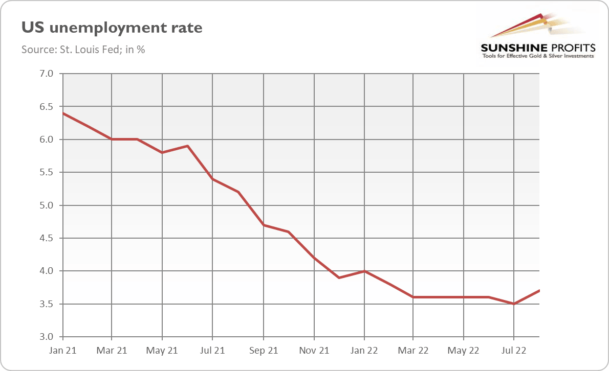 Powell, we could have a problem! According to the BLS, the U.S. unemployment rate rose to 3.7% in August from 3.5% in the previous month, as the chart below shows. It seems to be a fatal blow to the narrative of a strong labor market.