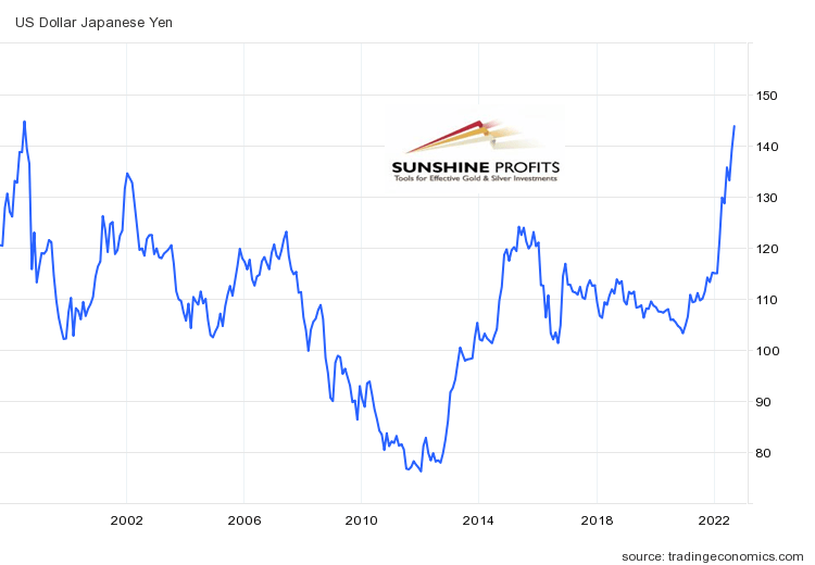 The Fed’s tightening cycle is not the only reason behind the current strength of the U.S. dollar. Another is the relative dovish stance of other major central banks as the ECB and Bank of Japan. As a consequence, the Japanese yen plunged to the level of 143 per dollar, the lowest level since July 1998, as the chart below shows.