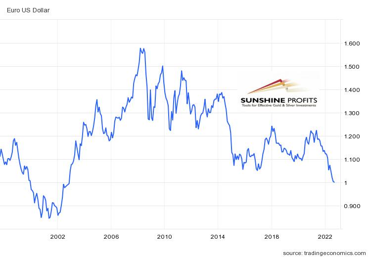 Similarly, the EUR/USD exchange rate has recently tumbled below parity, and also the lowest level since October 2002, as one can see in the chart below. The ECB is not as dovish as the BoJ, but the euro is suffering due to the European energy crisis. The common currency slumped this week after Russia shut the key Nord Stream 1 pipeline into Europe, sending gas prices higher and boosting concerns about a recession.