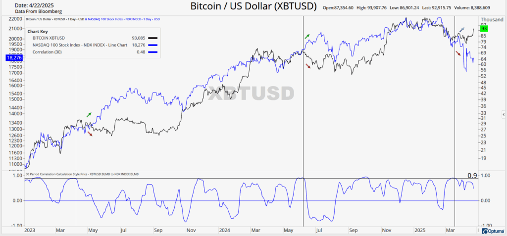 In the current divergence, Bitcoin is leading the upward trend, while the Nasdaq has continued to move lower. While it’s too early to determine who is correct this time, assets with high correlation can provide valuable insights into each other’s future movements. The question now arises: is Bitcoin truly leading the markets higher, or will the Nasdaq continue its streak of leading the way, albeit this time lower? Of course there is always the possibility that the correlation continues to break down and the divergence continues, but in the past, this has always resolved itself.