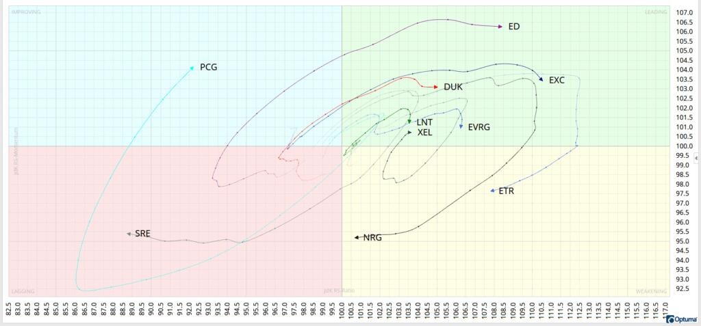 In this graph, I used 26-week tails to analyze the position of each sector relative to the S&P 500 over that period. Examining the tails reveals the rotation from the Consumer Discretionary sector’s outperformance to underperformance during that timeframe. These tails are helpful in being able to visualize the actual rotation within the market. The Utility sector, on the other hand, continues to advance into the leading quadrant, prompting a closer look at its constituents.