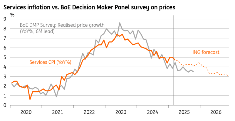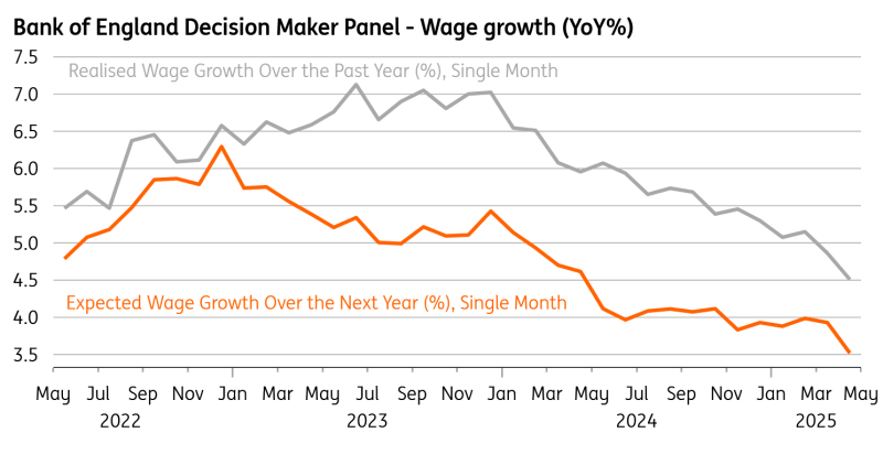 More generally, though, pricing power seems to be fading. The Bank’s Decision Maker Panel, which we know policymakers put a lot of weight upon, has shown a consistent drop in realised price growth over the past few months. That’s a decent lead indicator for services inflation, and were it not for some of the regulated price increases and sticky rents, it says it should be heading below 4%.