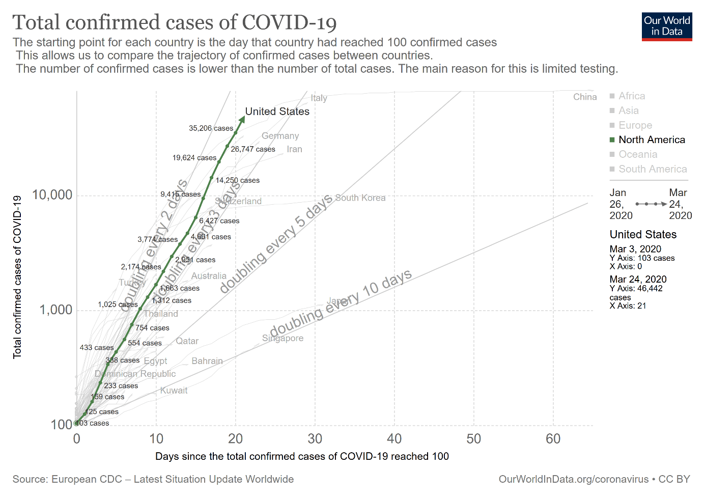 Chart 1: Trajectory of total confirmed cases since the 100th case in the United States and other countries