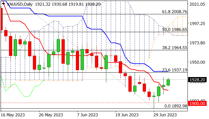 Gold price rises for the fourth consecutive day, extending recovery from a multi-week low at $1892 (June 29), after larger bears failed to clearly break psychological $1900 support and left a bear-trap.