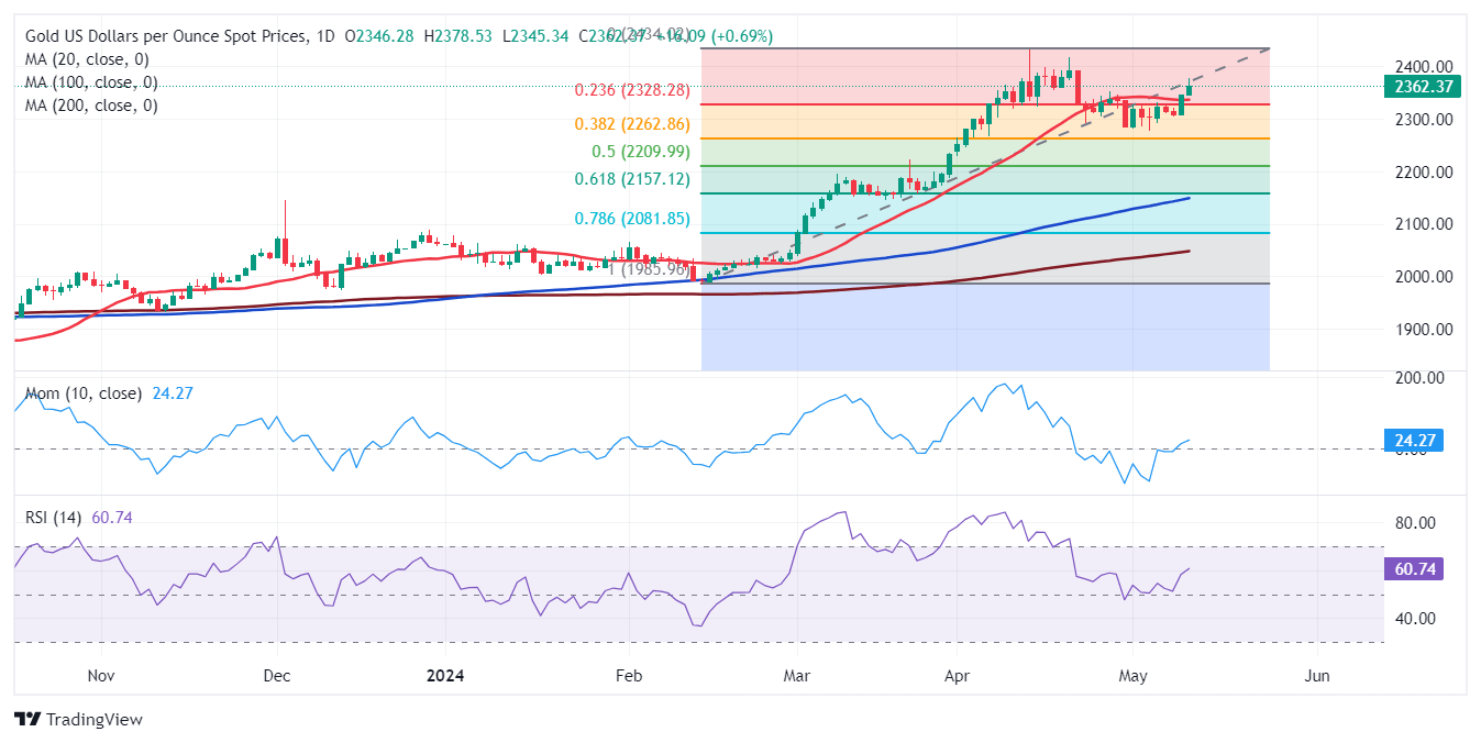 The bullish case is also clear in the daily chart. XAU/USD trades below a directionless 20 SMA, which provides dynamic support at around $2,035. At the same time, the 100 and 200 SMA picked up a bullish pace over $200 below the current level, suggesting the consolidative phase came to an end. Finally, the Momentum indicator crossed its midline with a vertical slope, while the Relative Strength Index (RSI) indicator advances at around 61, reflecting increased buying interest.