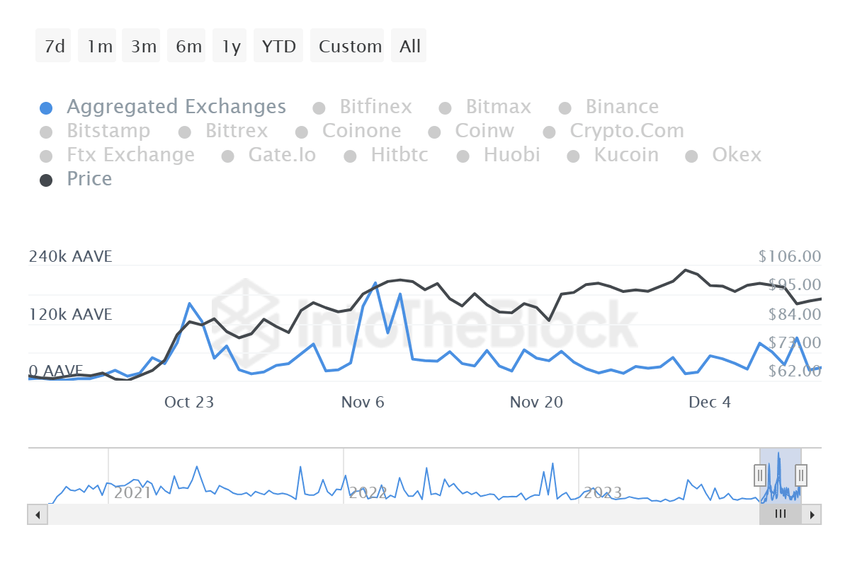 Elsewhere, on-chain aggregator IntoTheBlock’s inflow volume metric shows that the volume of AAVE tokens flowing into centralized exchanges has been reducing for the past three days, moving from 72,490 AAVE tokens on December 11 to 22,420 AAVE tokens on December 13. This constitutes a 69% drop in 48 hours and shows that interest in selling AAVE tokens continues to reduce.