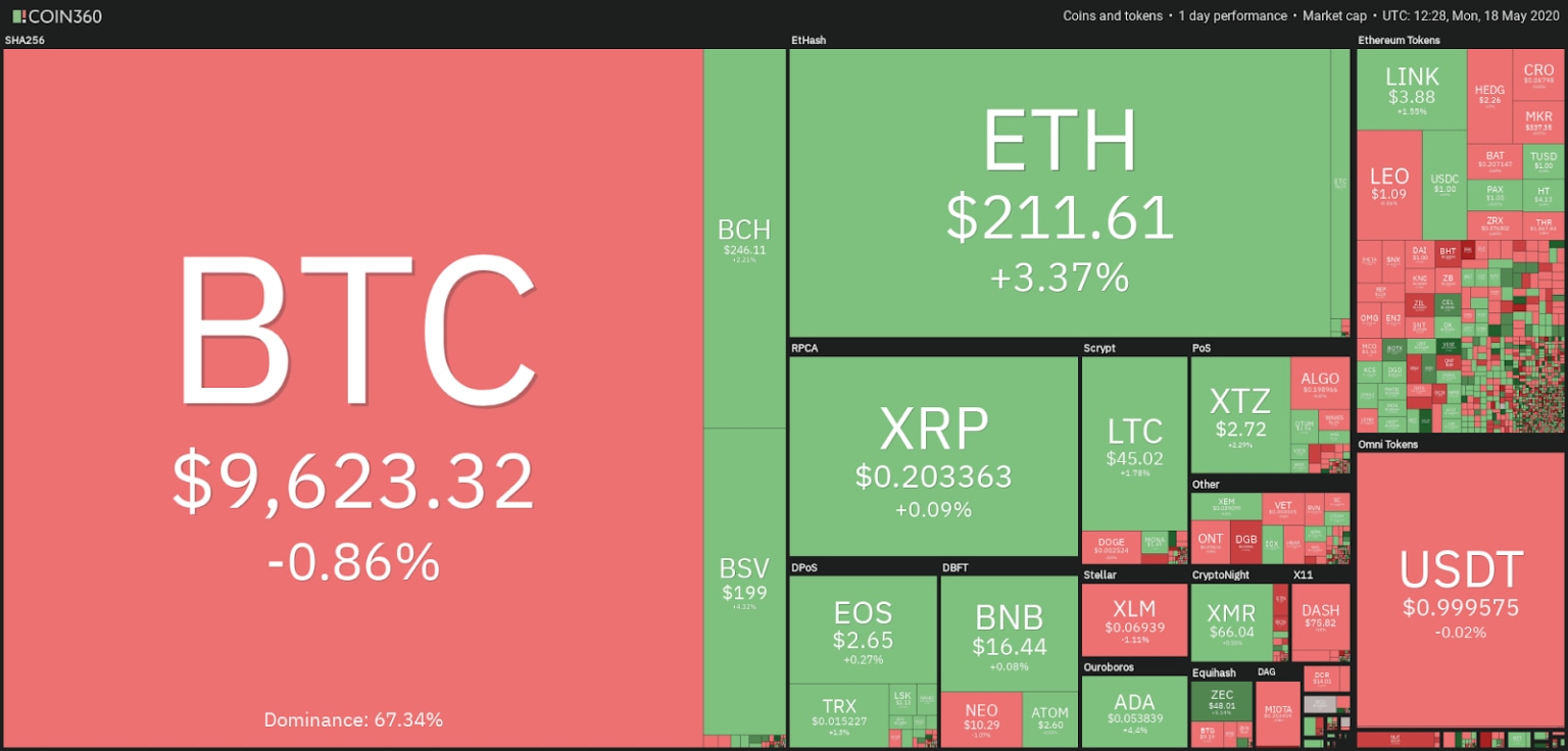 While Bitcoin has been acting inside a range of post-halving, the same can be stated about Ether. The price of ETH has found support in the $168-175 area, while the price is still unable to break through the upper barrier at $215-230.