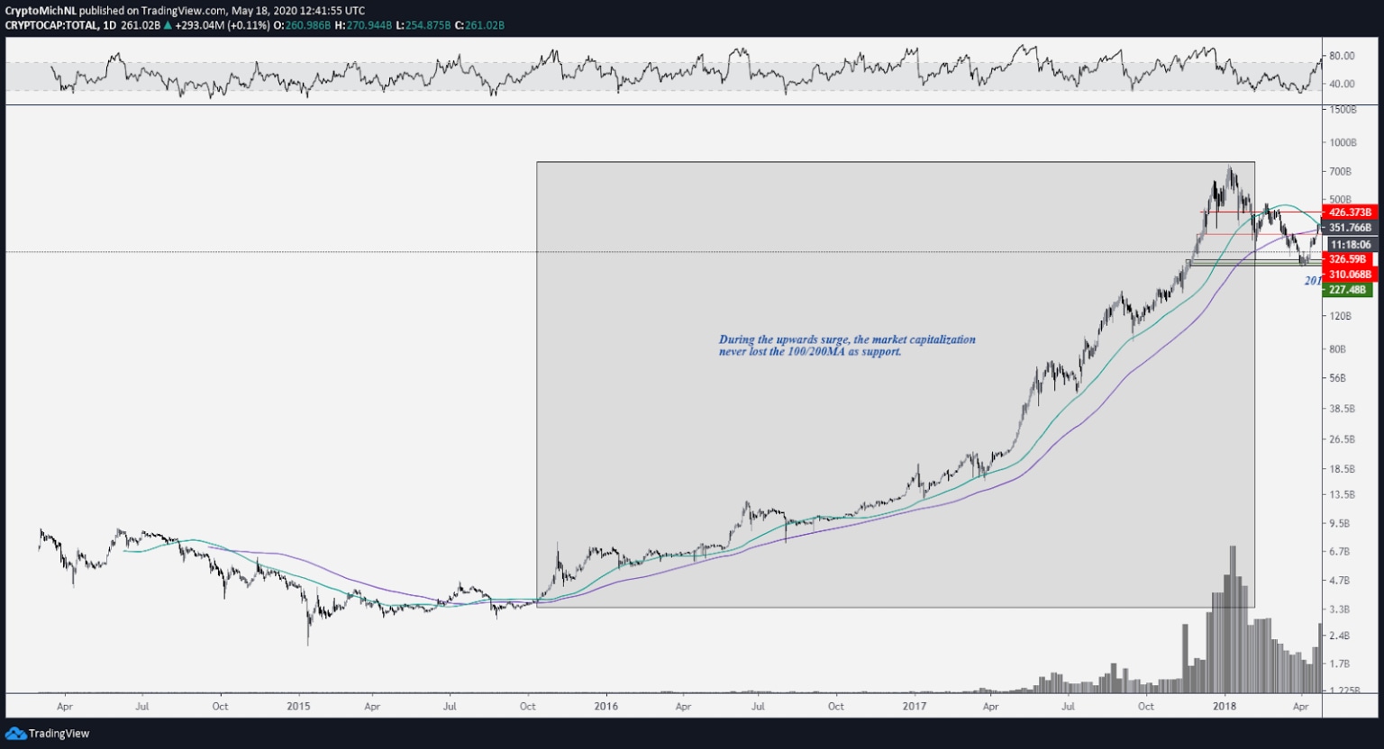 The significance of the moving averages is shown in this chart. Throughout the previous bull cycle, the total market capitalization never lost the moving averages until it lost the 100-day MA at the beginning of 2018.