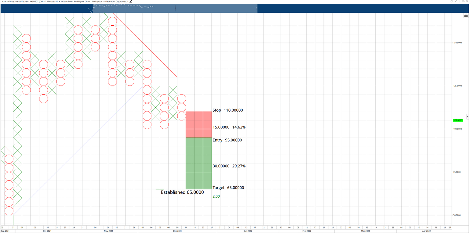 Because the overall trend is bullish, the long entry for the Axie Infinity price idea is the most likely to play out. Also, the long entry has several bullish events if triggered. First, the entry confirms the breakout above a triple-top. Second, the entry confirms a breakout above a bull flag. And third, the entry is a breakout above the prior dominant bearish trendline and converts the Point and Figure chart into a bull market.