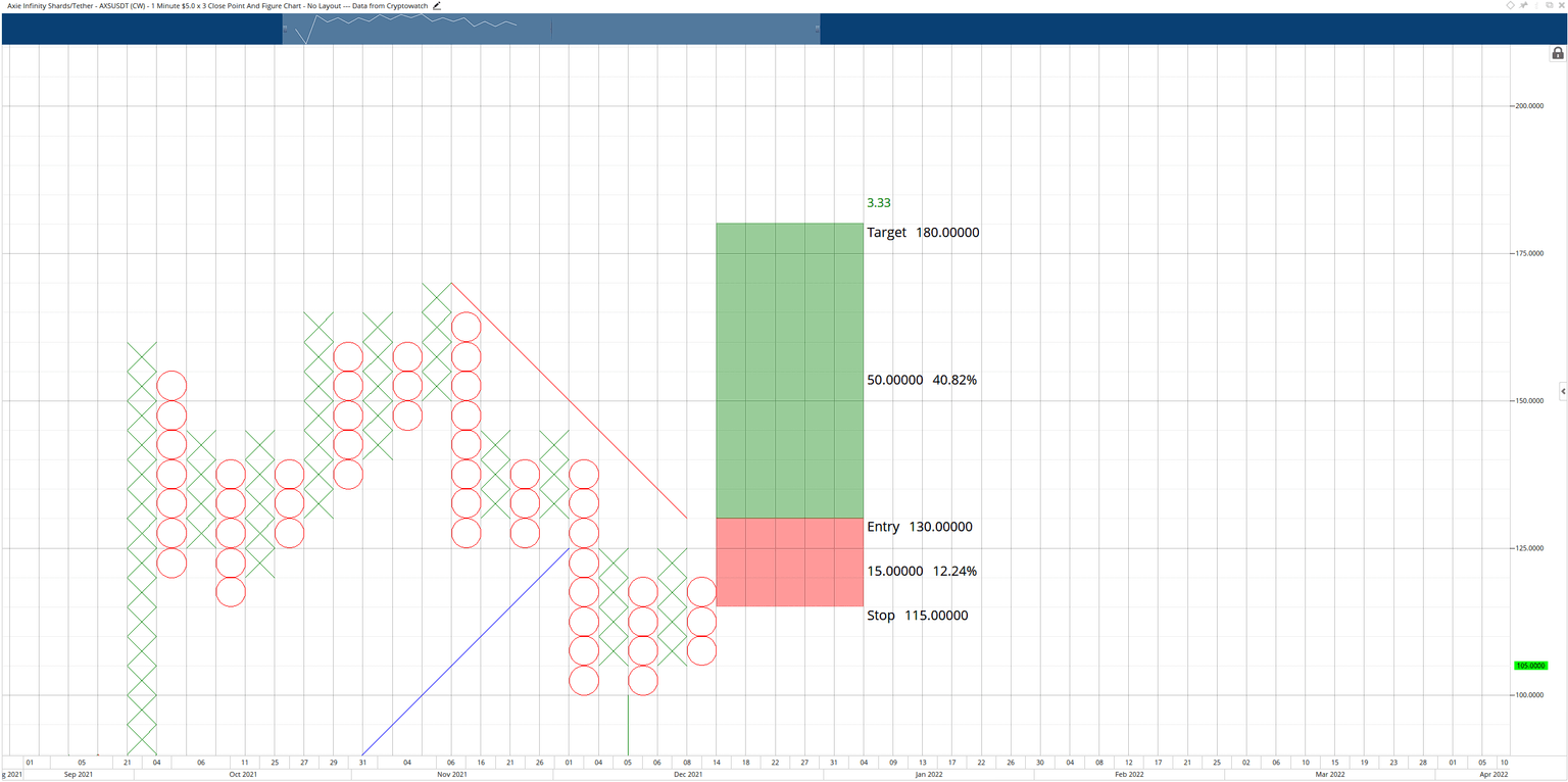 Axie Infinity price has two powerful trading opportunities on its Point and Figure chart that represent the long and short sides of the market. The first trade idea is a theoretical long entry with a buy stop order at $130, a stop loss of $115, and a profit target at $180. This trade idea represents a 3.33:1 reward for the risk.
