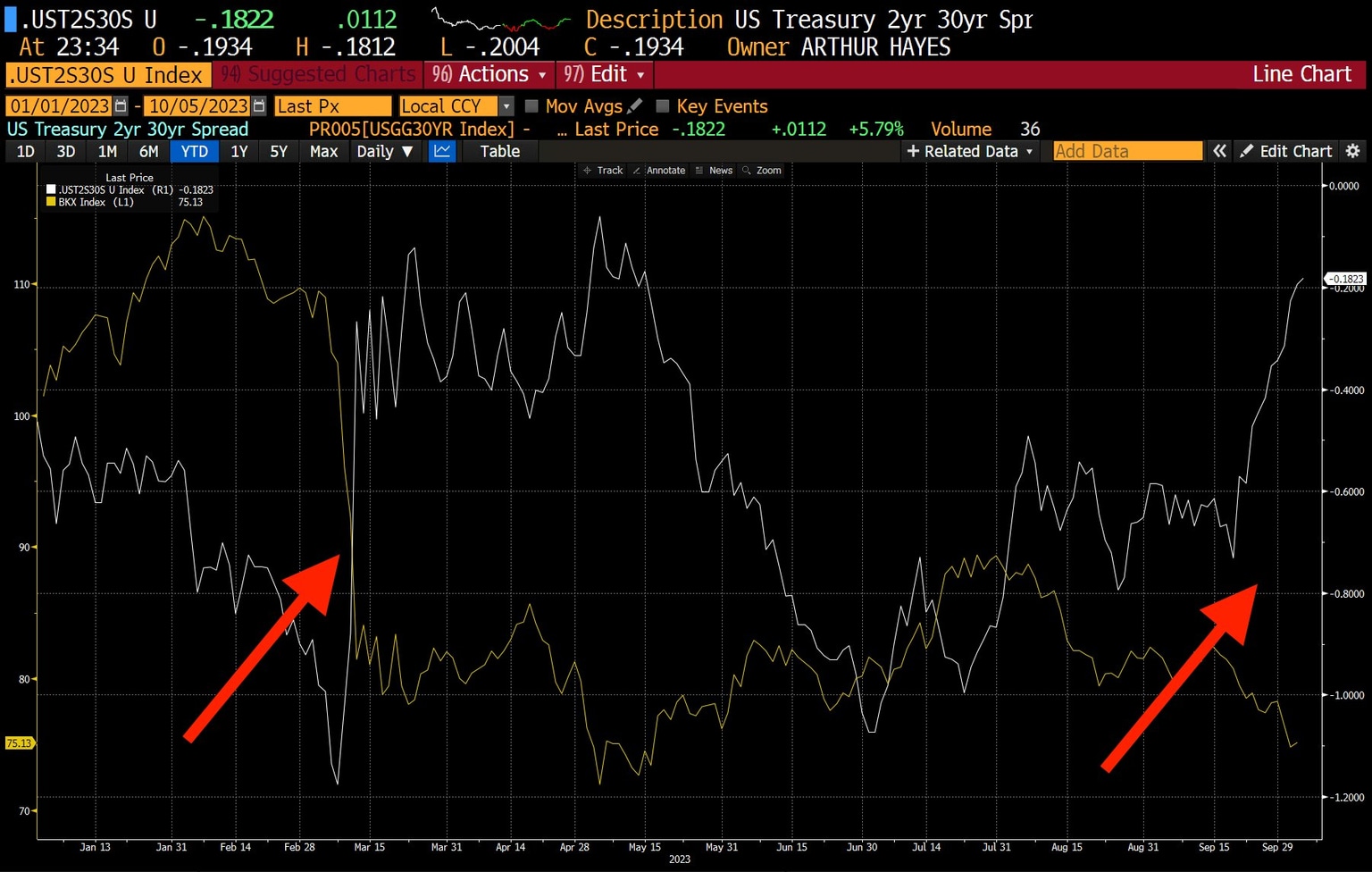 Hayes underlined the rise in the 2-year and 30-year Treasury yield spread, which he thinks will negatively impact bank stocks.