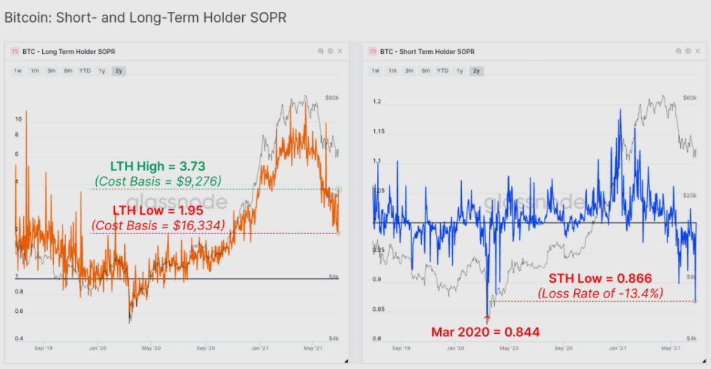 According to data from Glassnode, the downside price action over the past week “appears to have created a panic” for both long and short term holders “as demonstrated by the volatility in LTH-SOPR, and deep capitulation in STH-SOPR.”