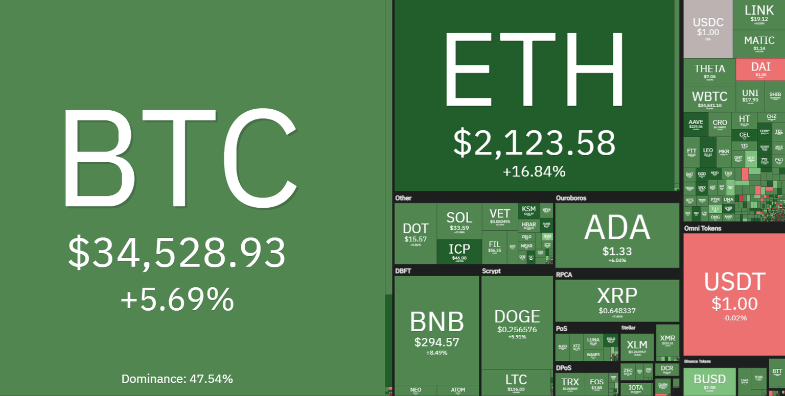 Most altcoins saw a turnaround in prices as Bitcoin showed signs of life above $34,000, including a 15.7% gain in Ether (ETH) price that briefly lifted the top altcoin back above $2,100.