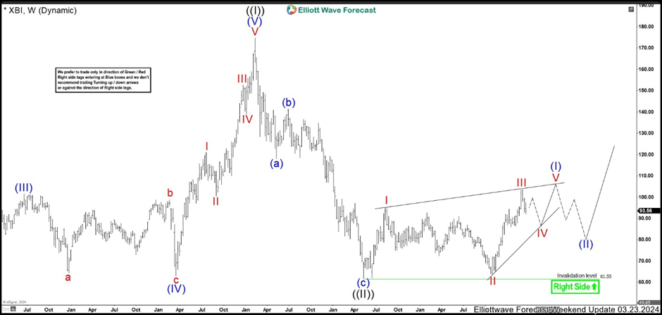In the chart above for the month of March, we can see the path we are expecting for XBI. It had finished a Great Super Cycle at 174.79 high and then made a correction. The pullback developed a zig zag structure where wave (a) ended at 118.23 low. Immediately, we had a short wave (b) that reached 141.50 high and then resumed with the bearish movement. Wave (c) extended reaching the 61.78 low to complete wave ((II)). At this point, we looked for a bullish continuation; however, by that date the structure was not clear. Since with only have 3 waves, it could be a diagonal or a nest-type structure. The coincidence with the 2 structures is that both had to correct before continuing upwards and we lean towards the diagonal because it is more conservative, as we see in the chart.