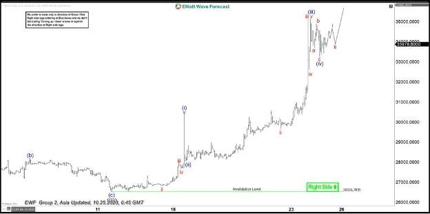 Up from wave ((ii)), wave i ended at 27113.3 and dips in wave ii ended at 26825.8. Bitcoin then extended higher in wave iii towards 27972.8 and dips in wave iv ended at 27680.1. Final leg wave v ended at 39377,3 which completed wave (i). Pullback in wave (ii) ended at 28042.70. Bitcoin then extended higher again in wave (iii). Up from wave (ii), wave i ended at 30335.7 and wave ii ended at 29669.50. Wave iii higher ended at 35150 and pullback in wave iv ended at 32671.30. Final leg wave v ended at 35152 which completed wave (iii). Pullback in wave (iv) ended at 33250. Near term, expect Bitcoin to extend 1 more leg to end wave (v) of ((iii)), then it should pullback in wave ((iv)) and turns higher again. Near term, as far as pivot at 26526.78 low stays intact, expect pullback to find support in 3, 7, or 11 swing for further upside.