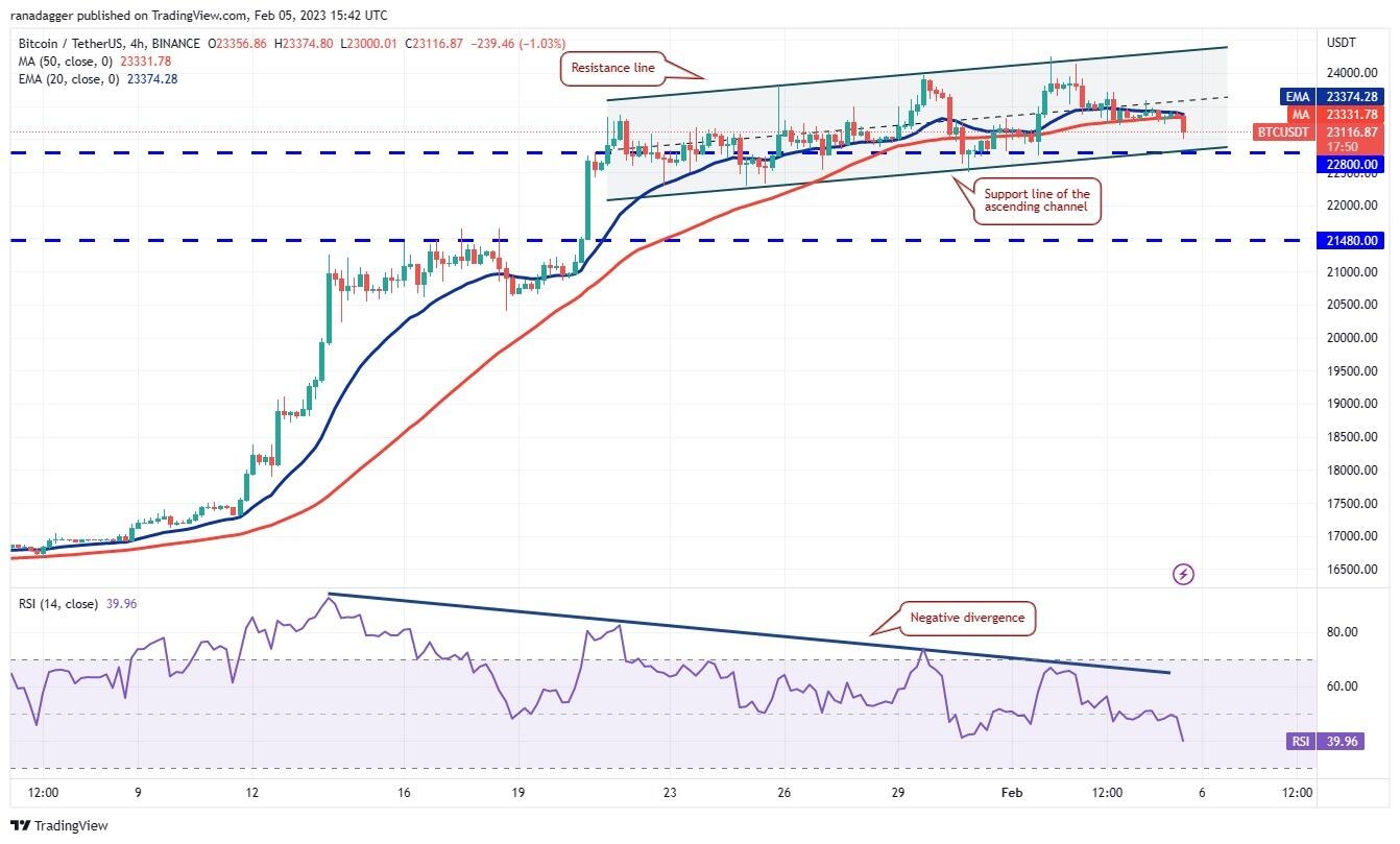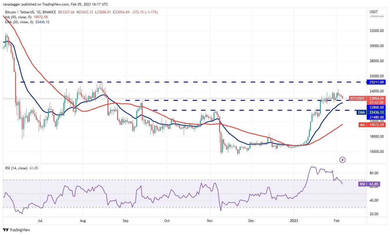Bitcoin has been gradually correcting since hitting $24,255 on Feb. 2. This indicates profit booking by short-term traders. The price is nearing the strong support zone between $22,800 and $22,292. The 20-day exponential moving average ($22,436) is also located in this zone, hence the buyers are expected to defend the zone with all their might.