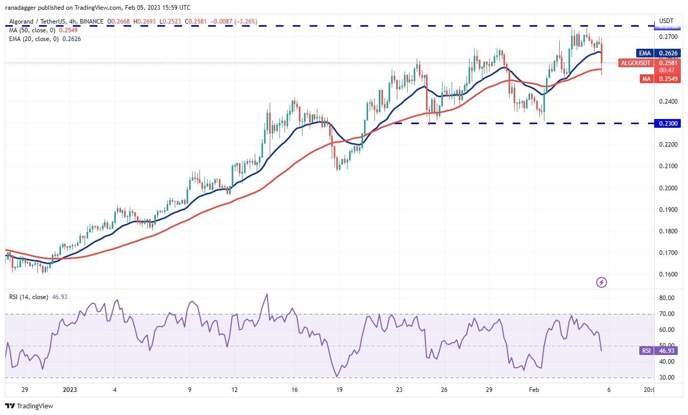 The upsloping 20-day EMA ($0.24) and the RSI in the positive territory indicate that bulls have the upper hand. If the price turns up from the 20-day EMA, the likelihood of a break above $0.27 increases. The ALGO/USDT pair could then travel to $0.31 where the bears may try to offer strong resistance.
