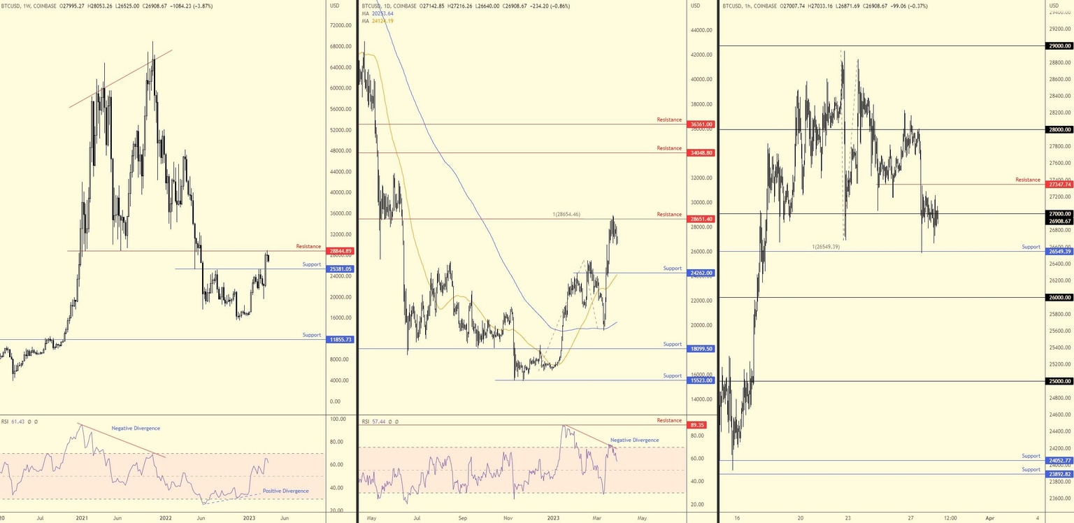 Therefore, from a technical standpoint, attention will be on H1 levels: support at $26,549 and resistance at $27,347. Trading between the aforementioned levels may be challenging. However, given the conflicting signals witnessed on the bigger picture, pushing beyond one of these levels may provide a foundation for a breakout scenario. For example, a breakout below $26,549 support, in line with higher timeframe resistances, could see price aim for $26,000. On the other hand, a breakout above $27,347, in step with the higher timeframe’s trend, might see price approaching $28,000.