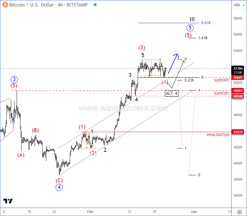 As you can see today after only a month, Bitcoin is already back to highs in an impulsive fashion and it's ideally unfolding a new five-wave bullish cycle of the lower degree that can push the price towards 55k area or higher. So, after current wave (4) pullback that can be completed or still in progress just as a deeper flat, be aware of more gains for wave (5) towards 53k-55k area.