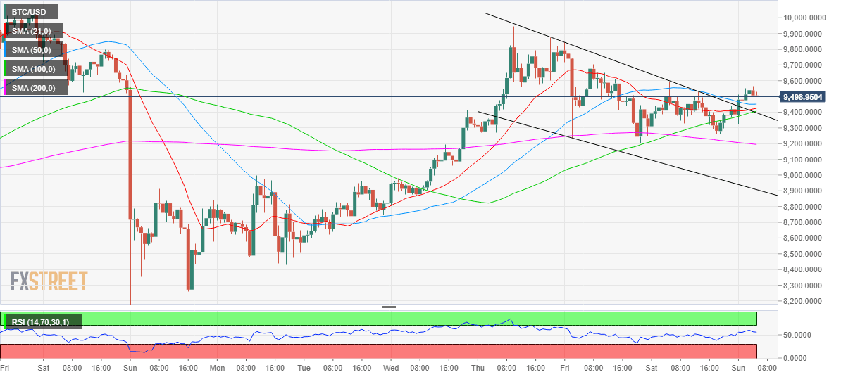 The retracement from higher levels could see the immediate cushioning at 9450, the horizontal 50-Hourly Simple Moving Average (HMA). A break below the latter could see at a test of the strong demand zone around 9420-9400, where the 21, 100-HMA and descending trendline resistance-now-turned support intersect. A failure to resist above the mentioned support area could trigger a fresh sell-off towards the key 200-HMA of 9195.17.