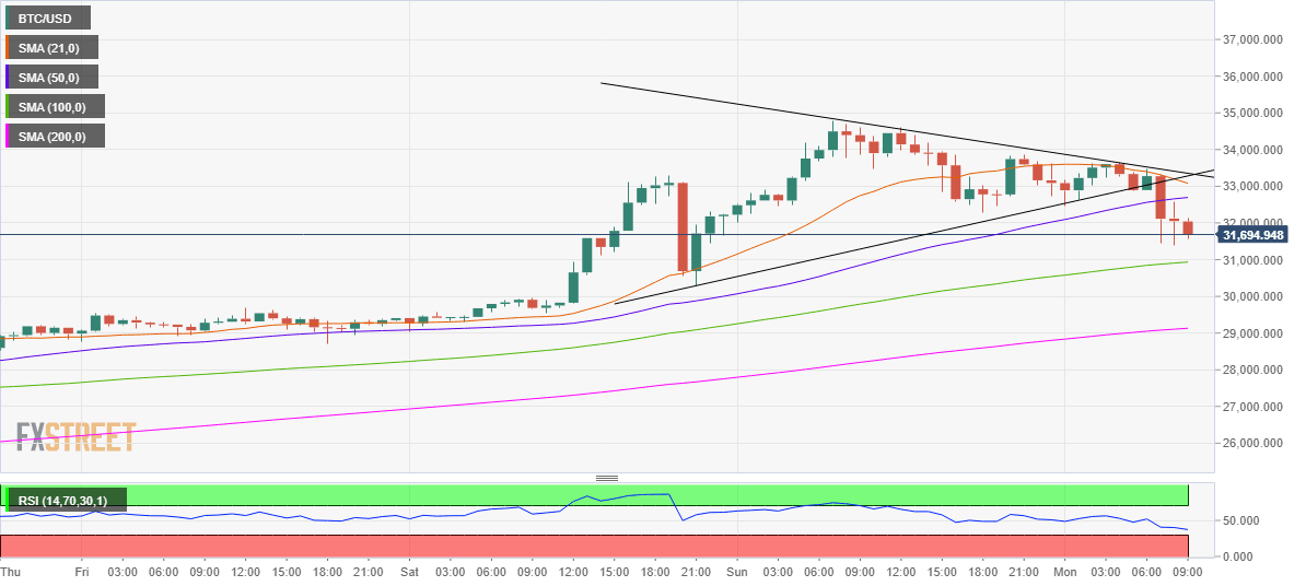 At the moment, the bears are taking a breather before the next push lower. Immediate support awaits at the 100-HMA of $30,935.