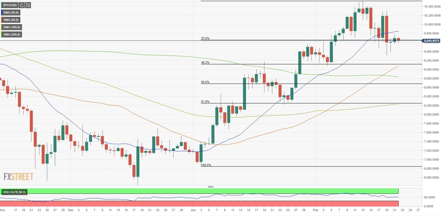 The Fibonacci %23.6 retracement of the rally that started in early January and ended in mid-February is located near $9,600. Above that level, the 20-day SMA at $9,850 could act as an interim resistance ahead of $10,000 (psychological level).