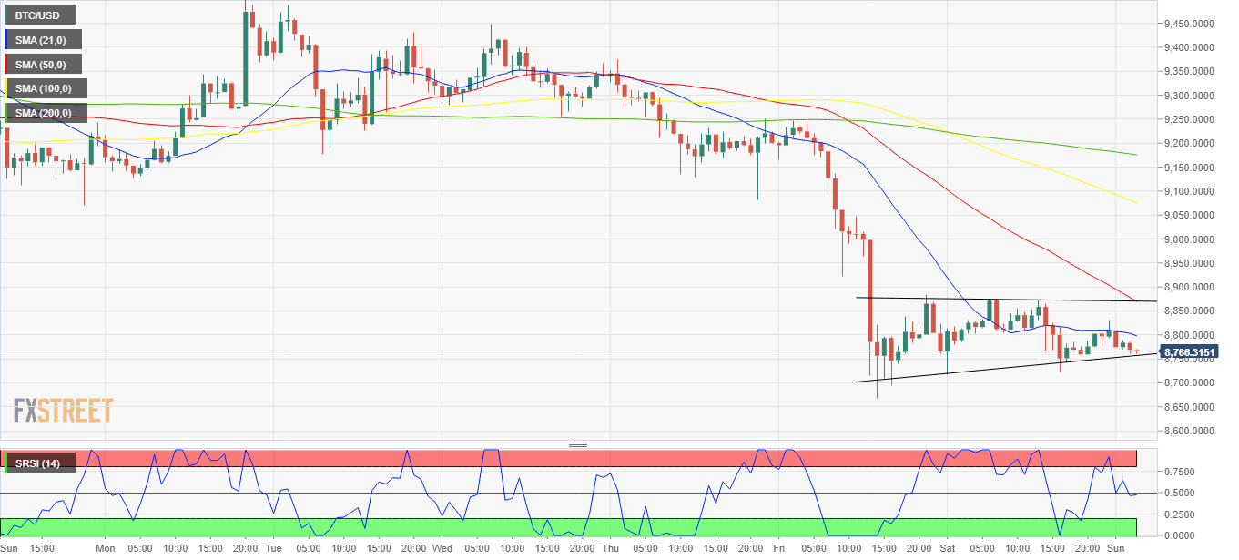 Bitcoin (BTC/USD), the most dominant cryptocurrency, reverses Saturday’s dead cat bounce from two-week lows of 8,668.60 as the sellers return in early Sunday trading. The recent profit-taking rally in the coin lost legs, as the technical charts painted a bearish picture amid a generalized downbeat tone seen across the crypto space so far this Sunday. At the time of writing, the No. 1 coin holds the lower ground near 8,750 region, down over 0.50% on the day while its market capitalization decreased slightly from $ 160.12 billion to $ 159.13 billion.