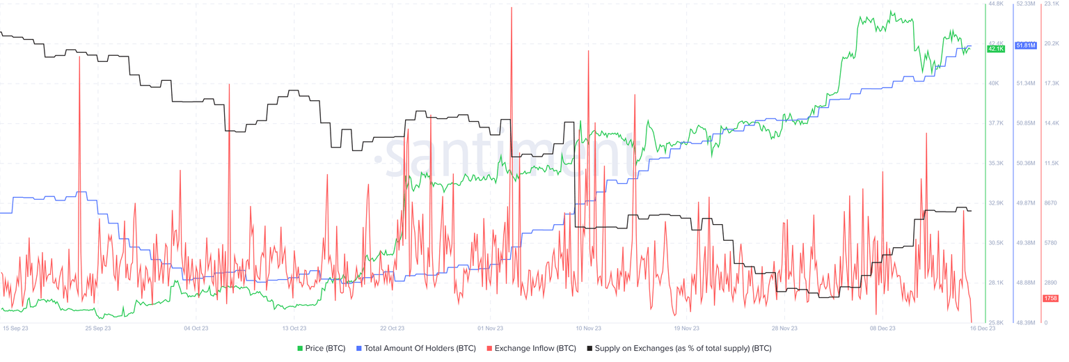 Evidence of the preference to hold is seen in the dwindling exchange inflows as investors are not interested in selling at the moment. Relative to this, the amount of holders is on a steady climb.
