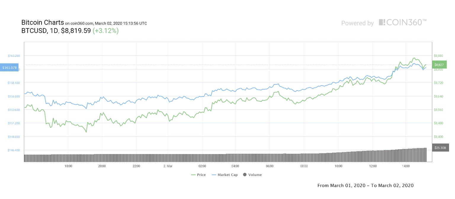 Bitcoin (BTC) continued to climb towards $9,000 on March 2, reaching a five-day high as markets appeared to recover from coronavirus fears.