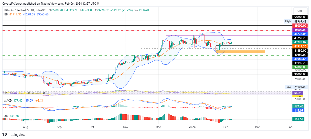 Despite BTC ETFs in the US proving popular, Bitcoin price is trading horizontally, absent any directional bias. It is trapped between the centerline and the upper band of the Bollinger indicator at $41,919 and $44,278, respectively.