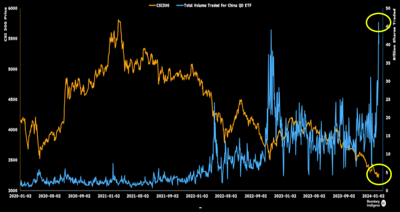 Reports by Eric Balchunas, a specialist at Bloomberg Intelligence focusing on exchange-traded funds (ETF), highlight that “Chinese investors are stampeding out of their local market in favor of the US-focused ETFs”. This is seen with spikes in total volume of ETFs traded in China.