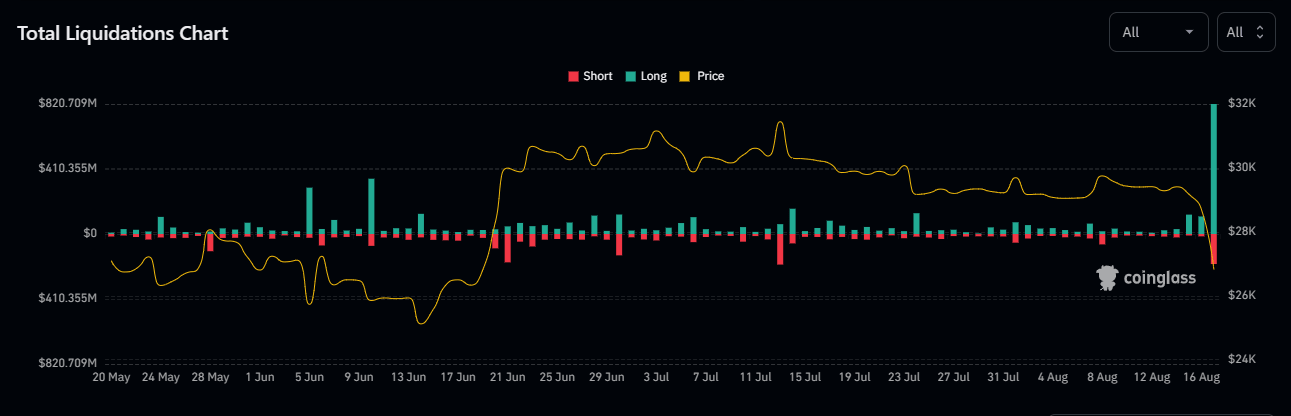 - The whiplash saw almost $820 million in total liquidations for long positions across the crypto market.