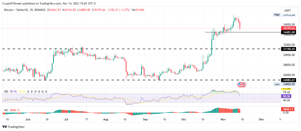 - Bitcoin price has dropped almost 5% on Tuesday to lose the $35,500 level as crypto markets grow anxious ahead of November 17.
