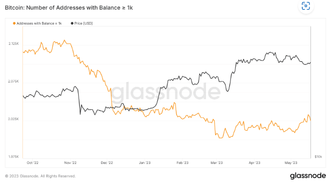 Meanwhile, Glassnode has used another spectrum to show a concerning stagnation among whale wallets. As shown in the chart below, whale addresses with between 1,000 BTC and 9,999 BTC have started to recover after the plunge around June 2022.