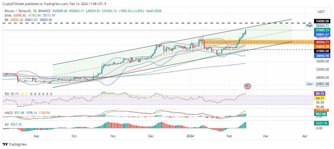 Increased buying pressure could see Bitcoin price enhance the climb, potentially breaking above the upper boundary of the channel to hit the $55,000 level. Such a move would constitute a 5% climb above current levels.