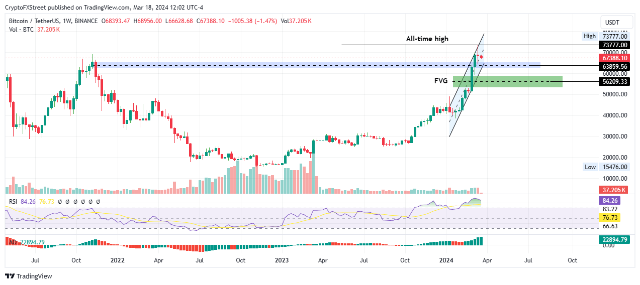 Conversely, if traders looking to buy the correction decide it is now time to enter, the ensuing buying pressure could send Bitcoin price north. Flipping the midline of the channel back into support could set the tone for a continuation, with Bitcoin price likely to reclaim the $73,777 peak on Binance Exchange.