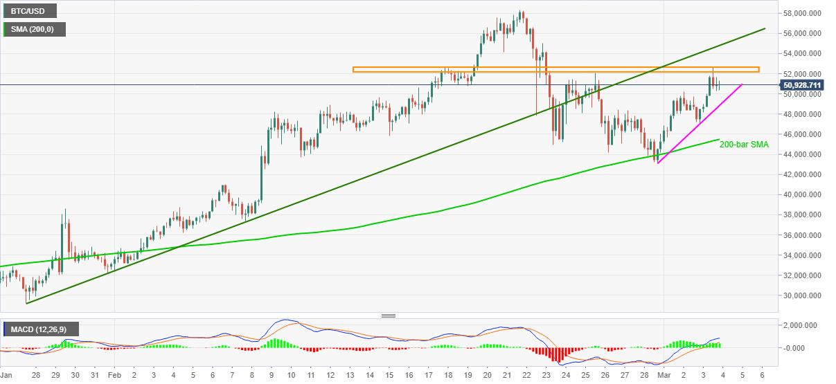 Bitcoin buyers can ignore the recent choppy moves around $51,000, currently near $50,900, while looking at the cryptocurrency pair’s ability to stay beyond the key supports during early Thursday. The BTC/USD optimism can also take clues from the bullish MACD signals to direct bulls towards a fresh high above $58,355.