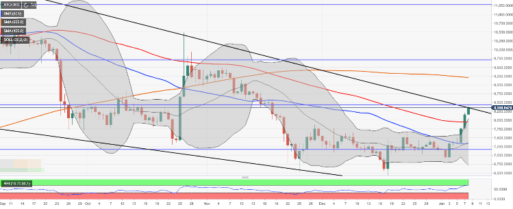 The world’s largest cryptocurrency hit $8,464 during early Asian hours before retreating to $8,348. The coin is trying to break the critical resistance created by the upper boundary of a descending wedge (currently at $8,350). Once it is out of the way, the upside is likely to start snowballing with the next focus on $8,450 (the recent high and 50% Fibo retracement) and psychological $9,000. If it is cleared, SMA200 (Simple Moving Average) daily at $9,200 will come into focus.