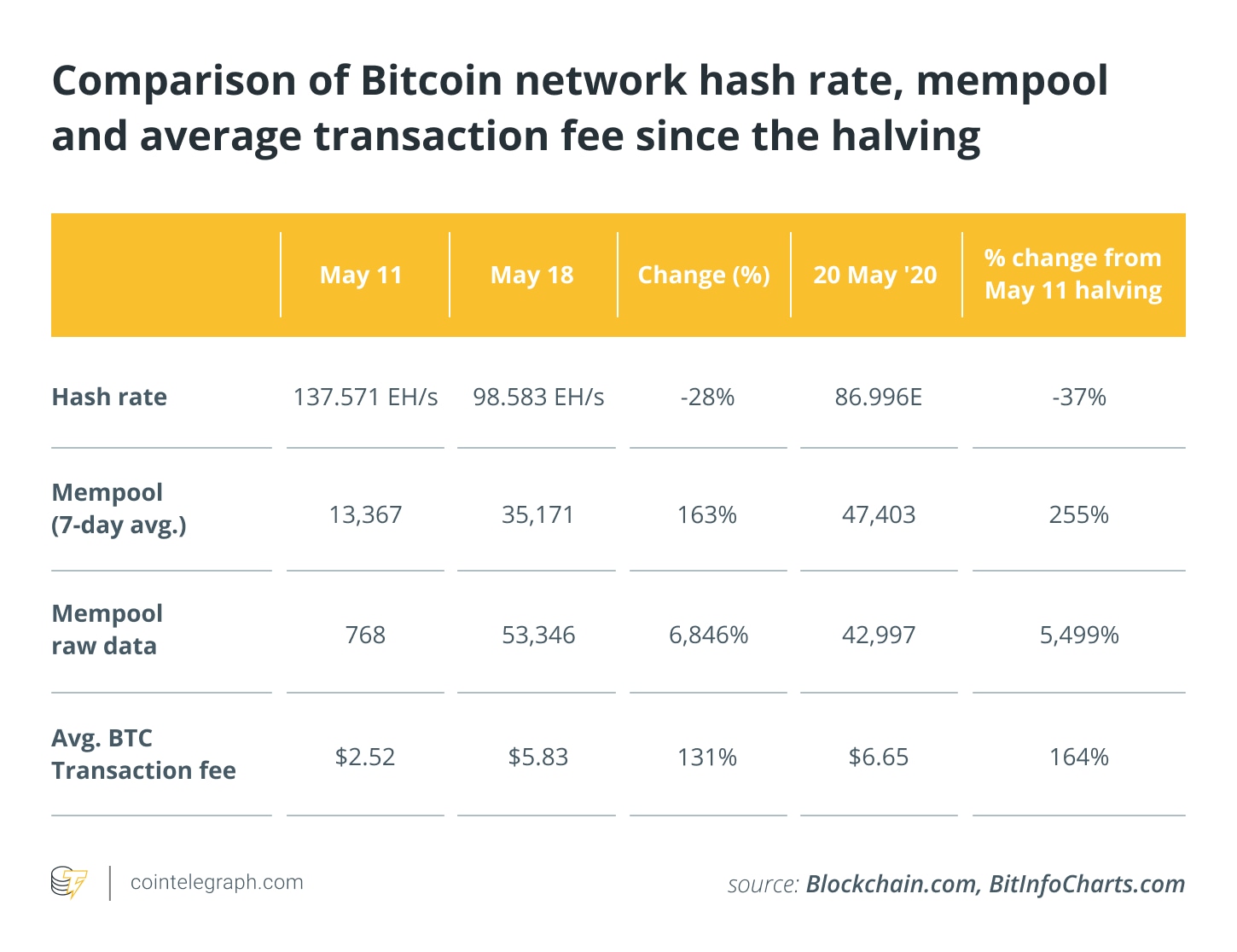 Christopher Bendiksen, the head of research at asset manager Coinshares, told Cointelegraph: “Lower hash rates, increased block times and, in the absence of some exogenous immediate drop in transaction demand, increased fee pressure, are very well-known effects of drops in mining reward.”