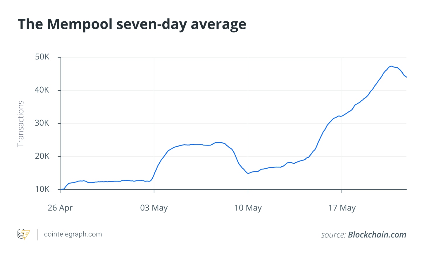Meanwhile, the total number of unconfirmed transactions in the mempool — a measure of network congestion, suggesting how long a BTC user might have to wait to complete a transaction — appeared to be improving. The seven-day average has been decreasing, and the raw daily totals dropped by some 10,000 unconfirmed transactions between May 18 and May 20.