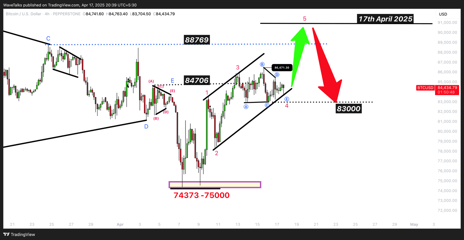 Once the Wave 5 is completed in the near term, Bitcoin may enter a sideways phase—This could result in range-bound, choppy price action before it eventually breaks through 88K–90K zone later once again.