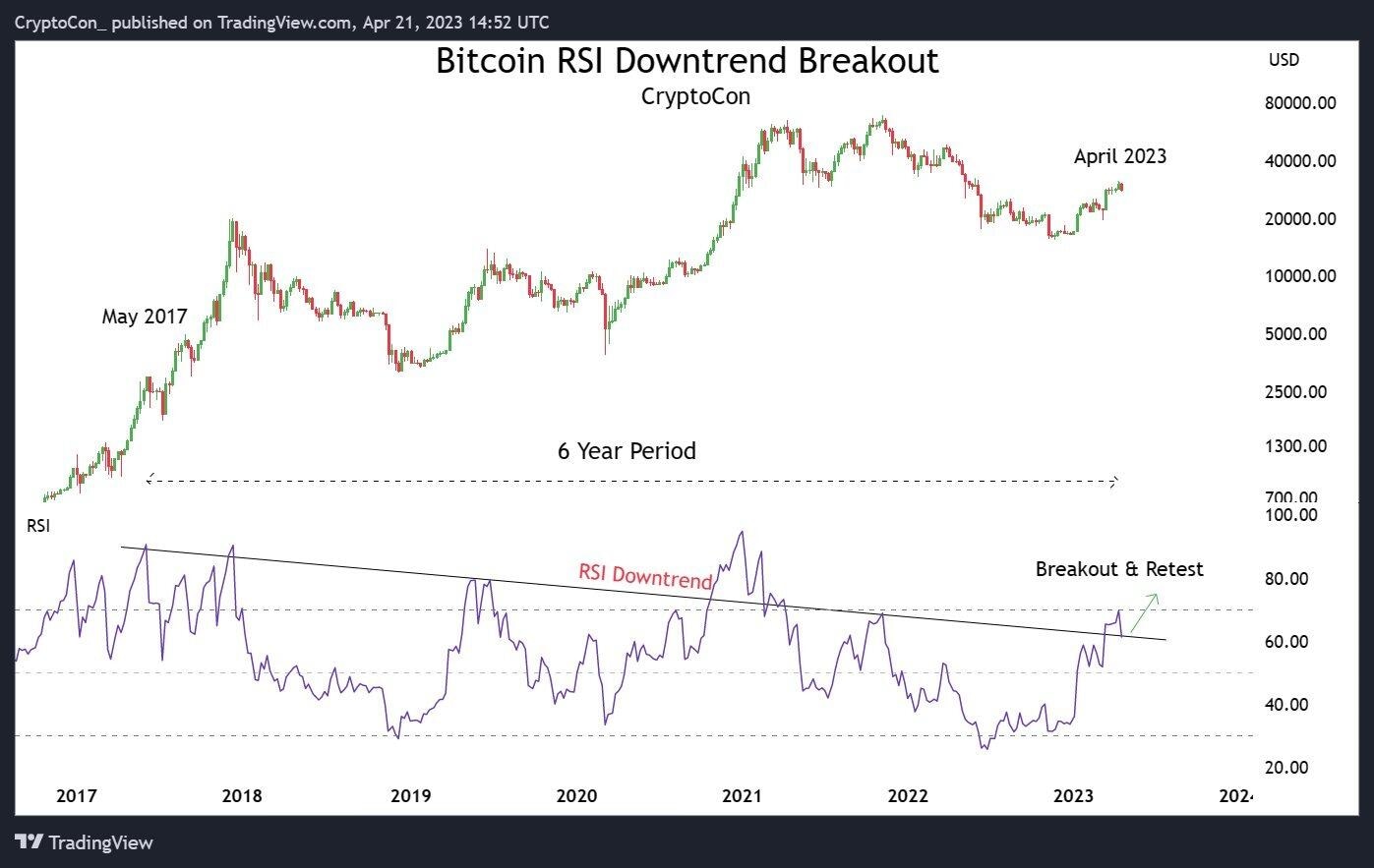 “Short term #Bitcoin price action seems grim, but behind the scenes, the Weekly RSI has broken out of a 6-year downtrend and is now attempting to make support,” CryptoCon revealed, comparing the latest action to prior halving cycles.